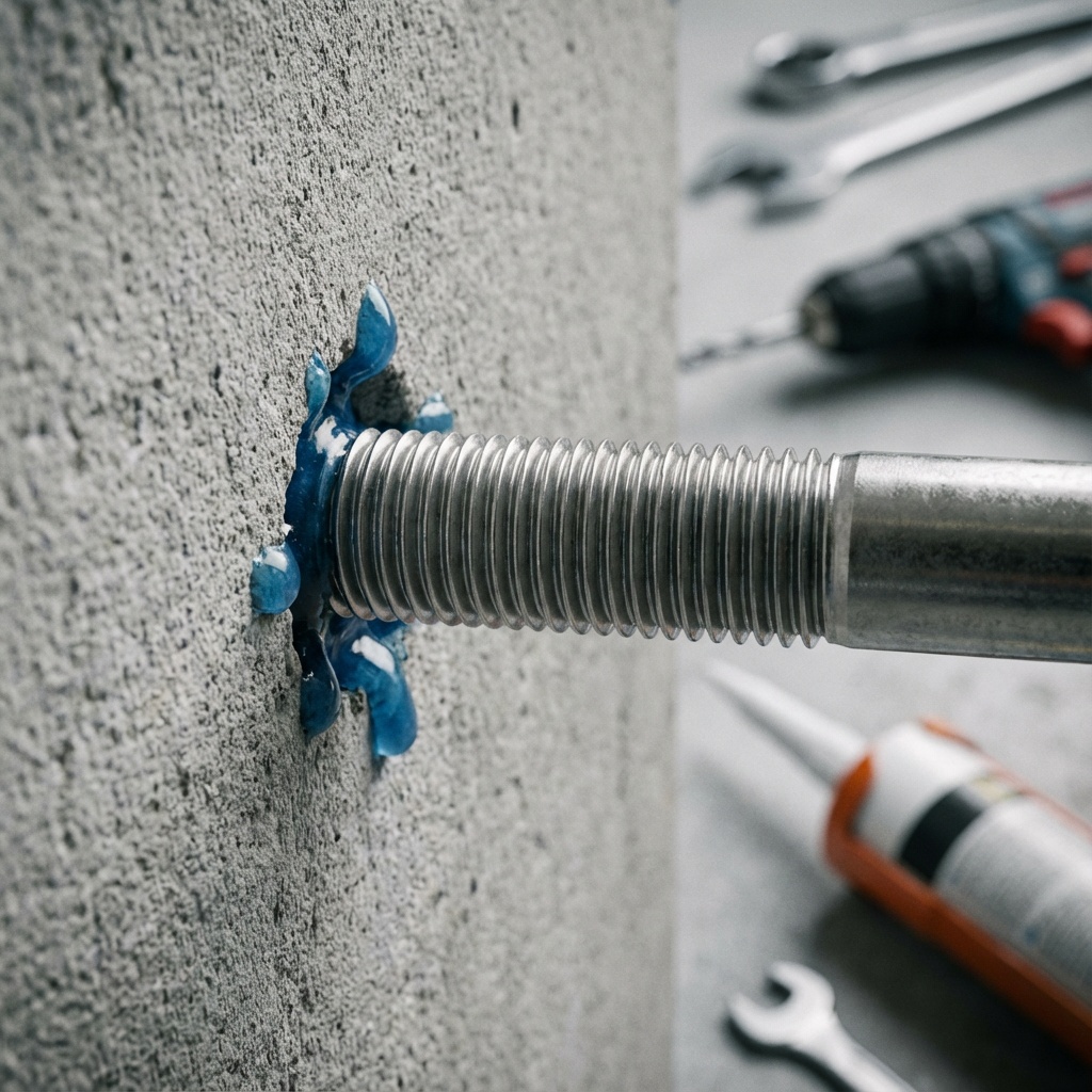 Quando lidamos com estruturas mais antigas, concreto com muitas ferragens ou substratos porosos (como tijolos estruturais), a fixação química é a rainha. A resina “solda” a barra roscada ao substrato, distribuindo a carga de forma uniforme e sem criar tensões de expansão que poderiam rachar o material.
