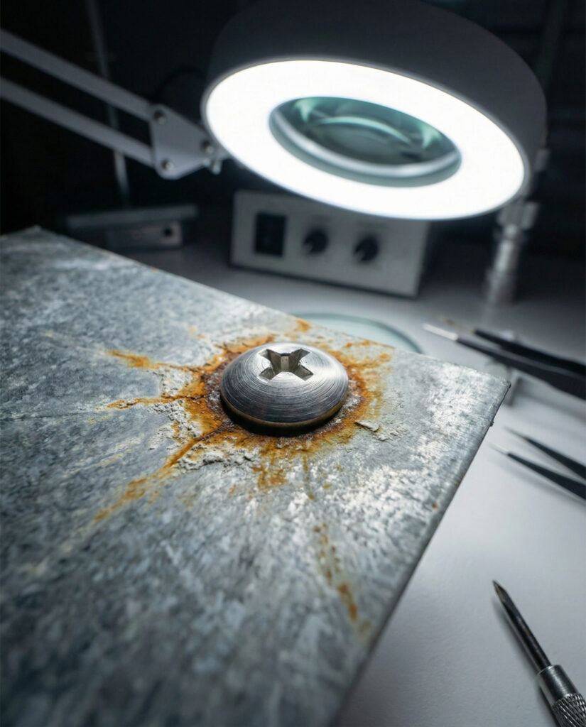 Se instalarmos aço inox diretamente sobre aço galvanizado sem o devido isolamento, a telha (anodo) será sacrificada para “proteger” o parafuso (catodo), resultando em corrosão severa em poucos meses.