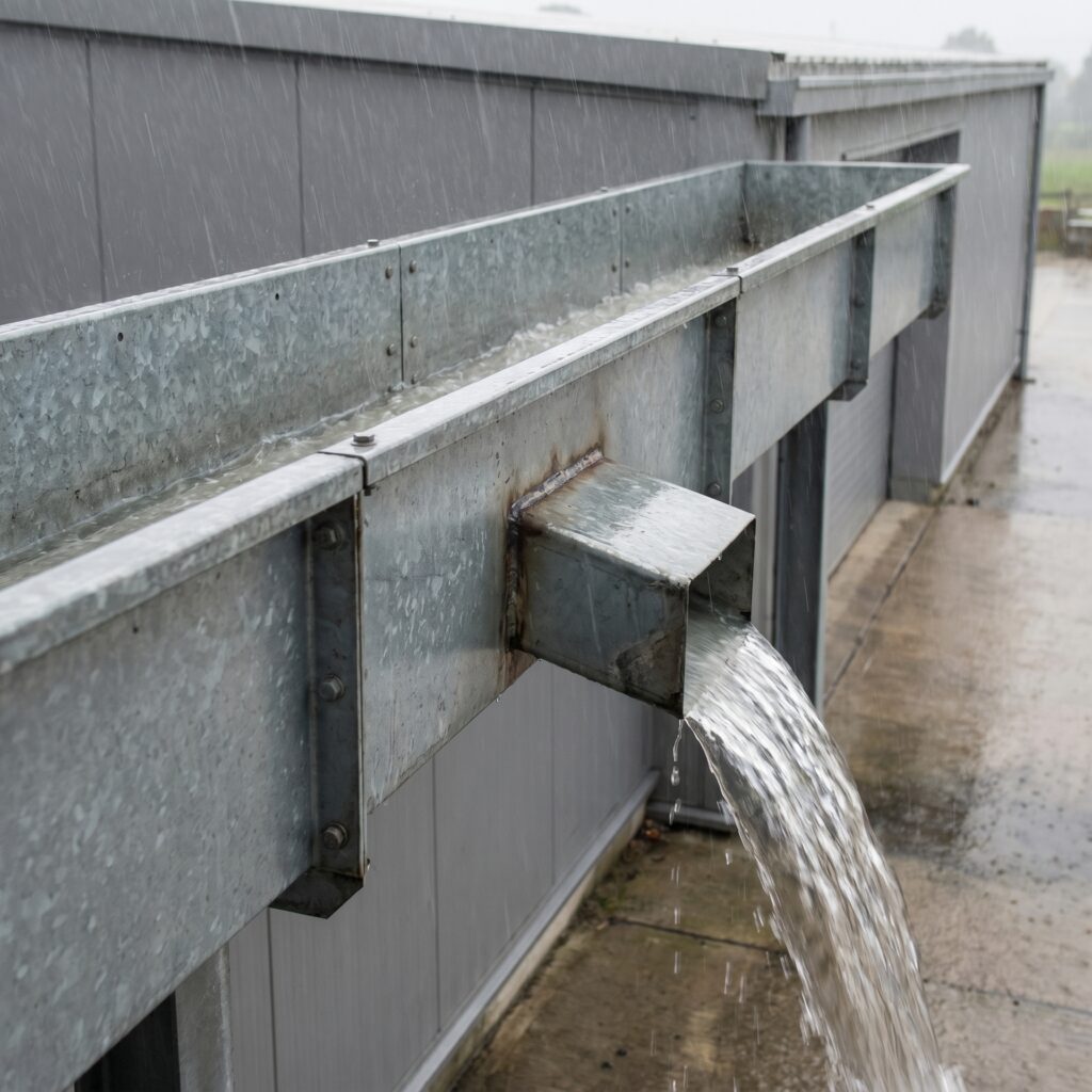 O extravasor é uma abertura estratégica na lateral externa da calha ou um bocal posicionado acima do nível normal. Se a água subir demais, ela sai pelo “ladrão” para o lado de fora da fachada, alertando visualmente que o sistema está no limite, mas mantendo o interior do galpão seco.